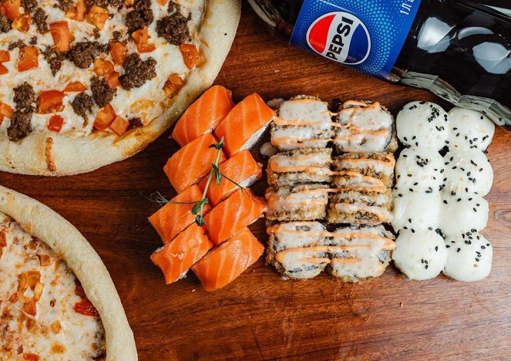 Филадельфия Сырный маки Темпура Фиш Пицца Болонезе Пицца Маргарита Пепси 1л 2 сои 1 васаби 1 имбирь Комплимен Палочки