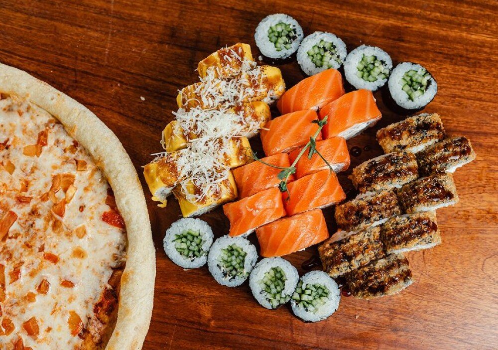 Пицца Маргарита Филадельфия 4 Сыра ролл Каппа Маки Кани темпура 2 сои 2 васаби 2 имбиря Комплимент Палочки