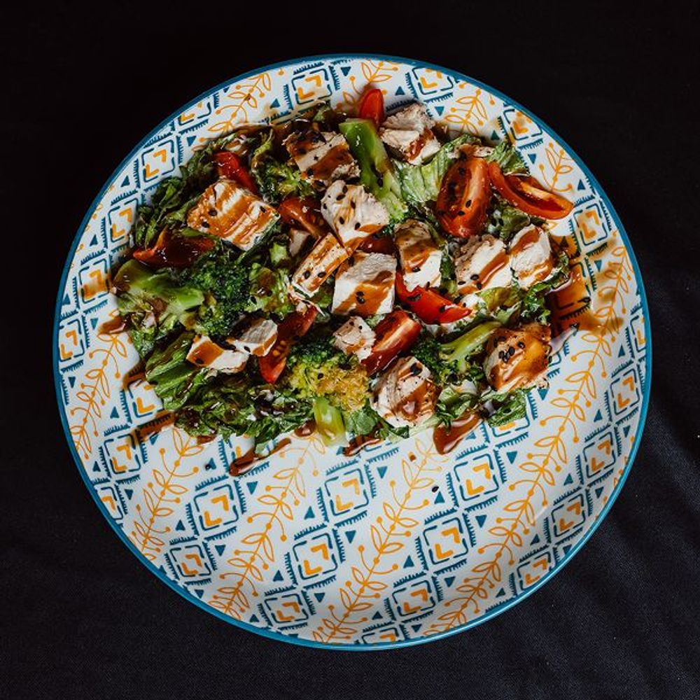 запеченная курочка,авокадо,брокколи, черри, лист салата, соус Терияки