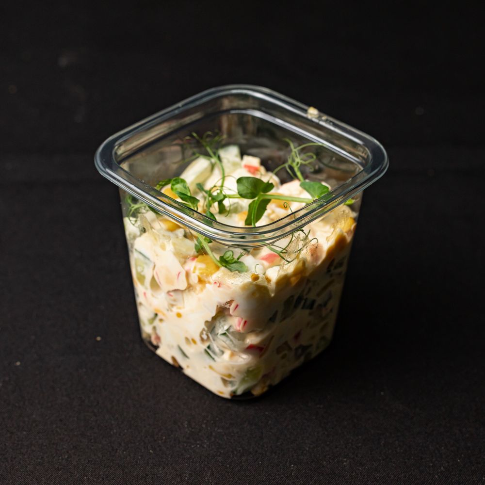 Классический рецепт крабового салата с крабрвыми палочками, кукурузой и рисом (в индивидуальном стаканчике 120 гр) - Заказ минимум от 10 штук