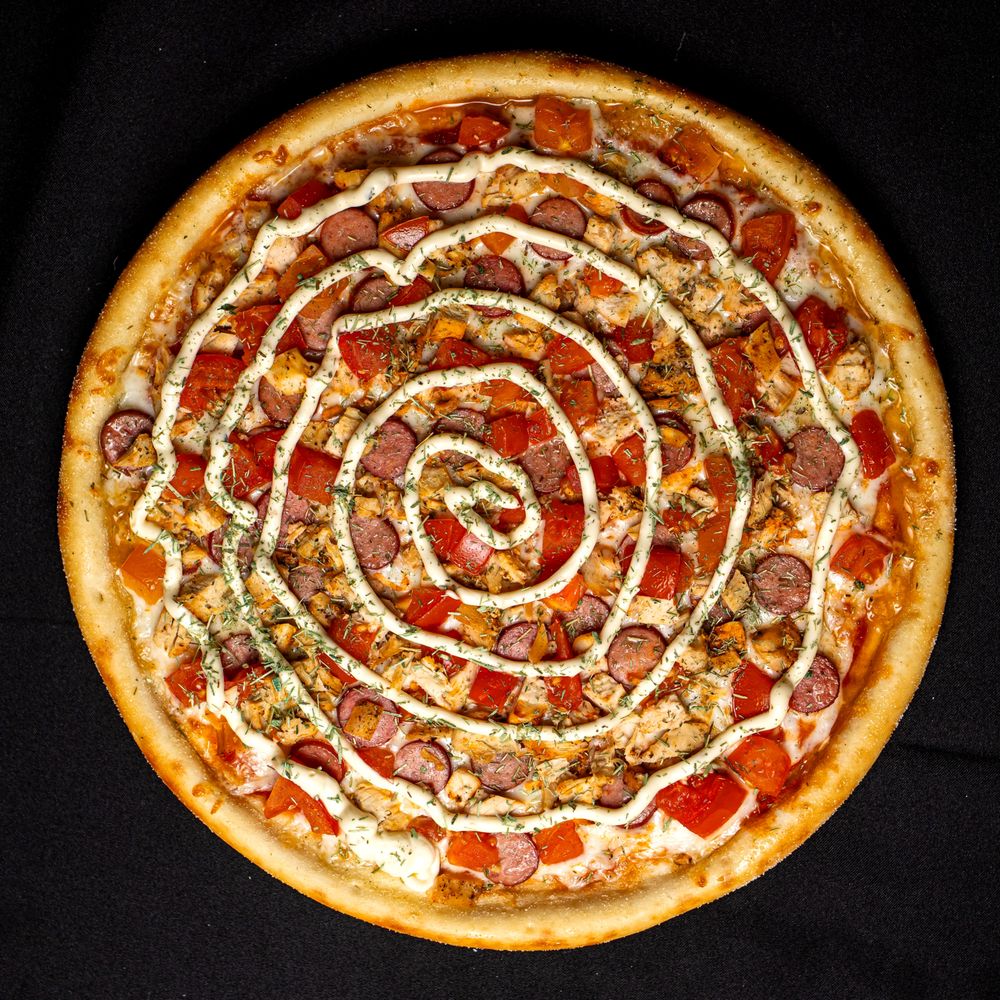 Томатный соус, аппетитная курочка, колбаски охотничьи, соус чесночный, помидоры, моцарелла Посыпается укропом